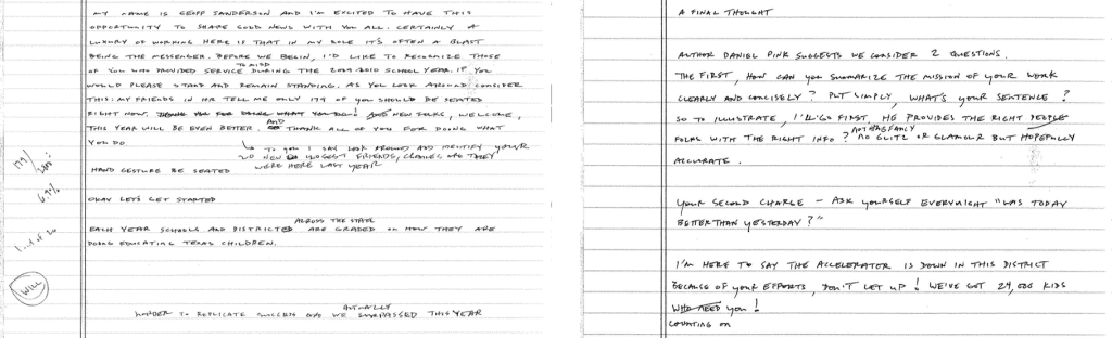 In August 2010 I was a featured speaker during our back to school kickoff pep rally. I’d spoken at these types of events before but at the time we had a new superintendent and were using a new venue. I can remember doing a walk through the evening before with our communications boss and our thought bubbles were surely in-synch. My bit part in this convocation was to provide the state of the district address – performance-wise how were our students doing? I had some slides to guide my speech but after 1 minute on the stage with 2,700 staff in seats waiting and needed technology not working, I winged it from memory. One key part I pitched to the crowd was “what was their sentence” which was an idea I borrowed from Dan Pink’s first book and a project he ultimately launched (watch this short video for more information). Back then I told the audience my sentence was “he provides the right folks with the right information.” As I look back now I realize I was the lowest person on that totem pole should things have gone sideways. They didn’t, thankfully, and I delivered my address on memory. As a very small side note, I’ll indulge and share that a senior cabinet member at the time pulled me aside to share off the books appreciation. I saved my hand written speech from back then as reminder…